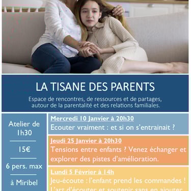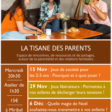 - Le dimanche 12 Octobre 2025, de 10h à 11h30.Tisane des parents - Voir Affiche dédiée pour les dates et sujets